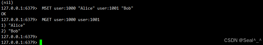 redis> MSET user:1000 "Alice" user:1001 "Bob"