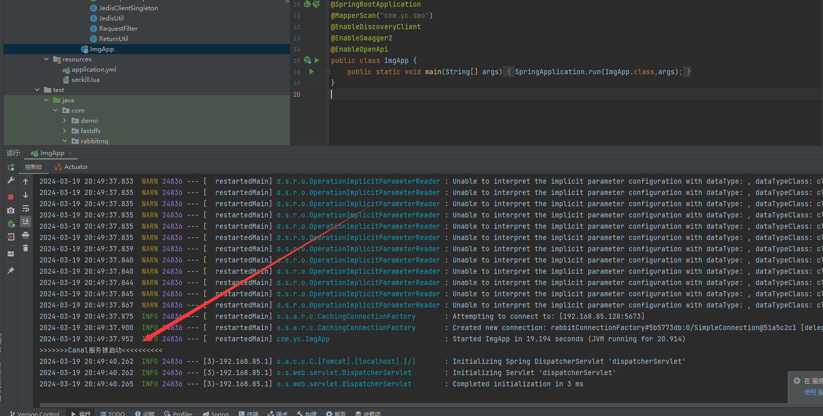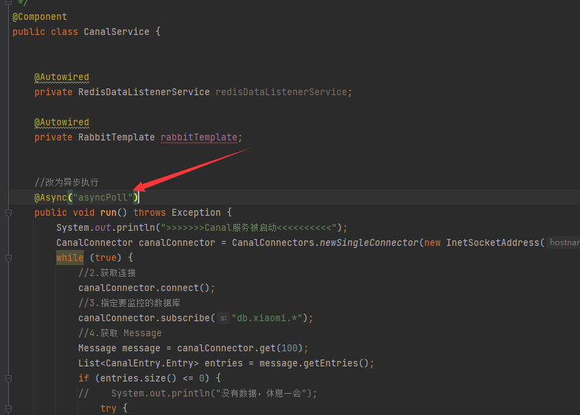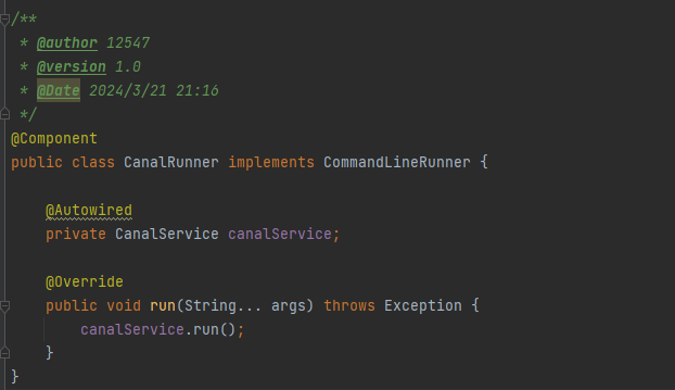 那么Canal类的代码如上图所示,因为他是监听功能,那么就要一直启动保持运行,目前是将Canal类放在页面访问服务实例中,那么在SpringBoot的Application启动时应该也要将Canal启动。Spring提供两种方式实现CommandLineRunner接口@PostConstruct注解来实现。