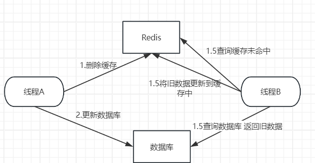 • 线程B从缓存中读取数据;由于缓存被删,进程B无法从缓存中得到数据,进而从数据库读取数据;此时数据库中的数据更新失败,线程B从数据库成功获取旧的数据,然后将数据更新到了缓存。