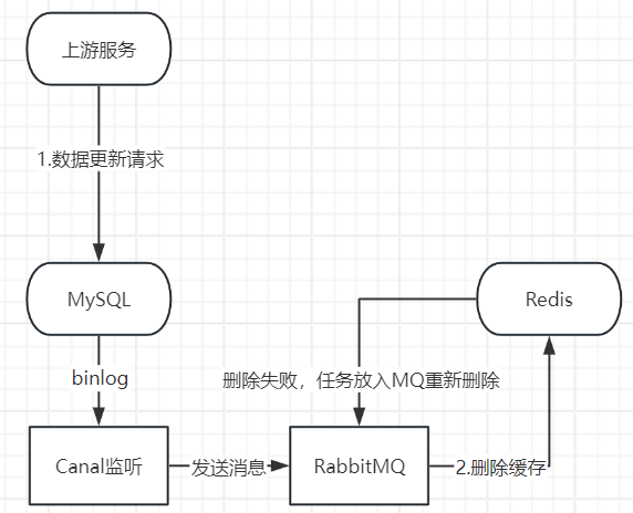即先更新数据库,然后在删除缓存,更新数据库后通过Canal拉去MySQL的binlog日志,将更新消息放入MQ,由MQ异步执行删除操作。