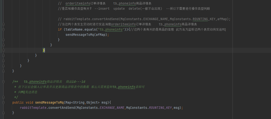 那么在Canal监听类中,当监听到数据变化后,将变化发送给MQ消息