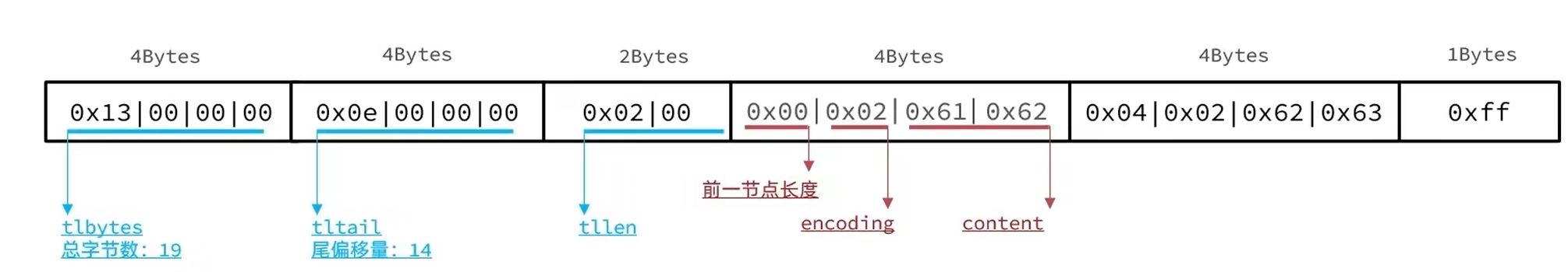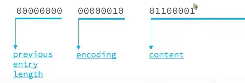 - 如果前一个节点的长度大于或等于254字节,则采用5个字节来保存这个长 度值,并且第一个字节是0xfe,后四个字节才是真实长度数据