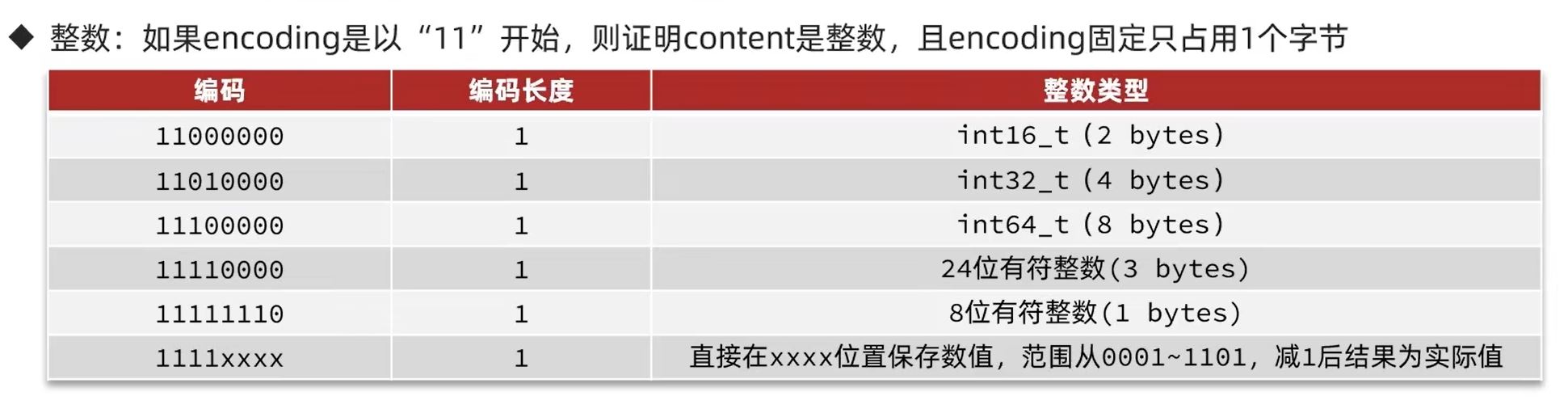encoding:存该节点的内容的编码,用来区分content是(自负床还是整数),并且存了 content的长度,占1,2或者5个字节稍后有详细解释