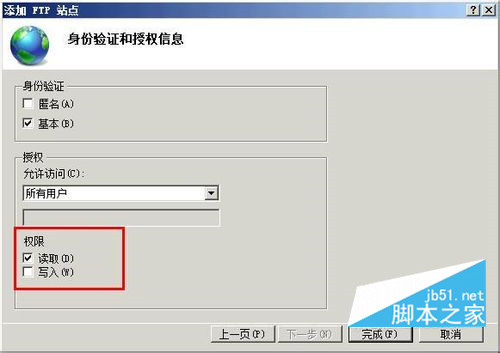 ​设置身份验证和权限,一般设置的权限为读取,写入的话有一些风险,需要谨慎。点击完成即可添加FTP站点。​