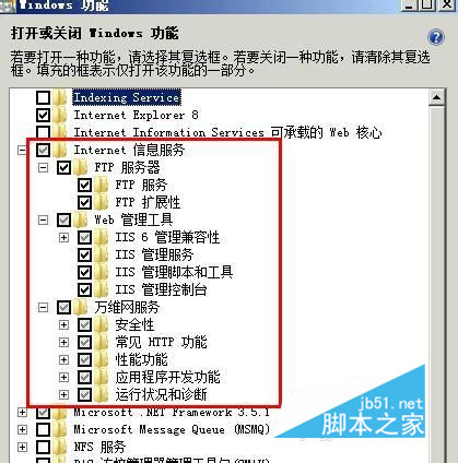 ​你会看到internet信息服务,将其子目录下的各项服务都打勾,点击确定,保存设置。
