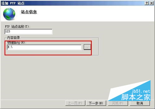 ​打开添加FTP站点的向导,给你的站点起一个名字,然后填写物理路径,这个路径是你的FTP存放的文件夹的路径,点击右侧的浏览按钮可以浏览文件夹,选择FTP的存放位置。点击下一步