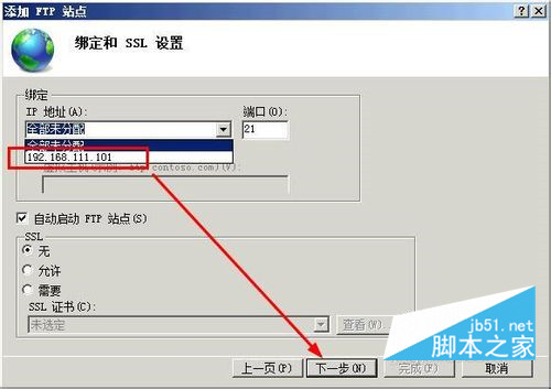 ​填写IP地址,你可以看到下拉菜单中有你的电脑的ip,ssl设置成无就可以额。点击下一步
