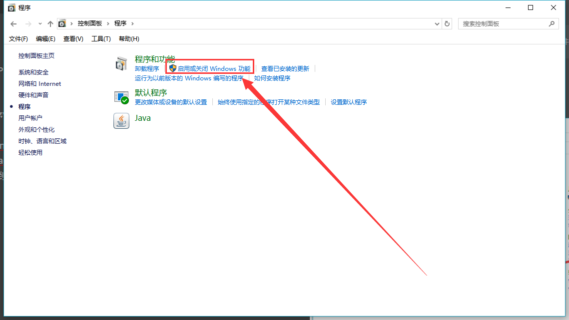 2.在打开的“程序”窗口中,找到“启用或关闭windows功能”点击打开,如下图所示: