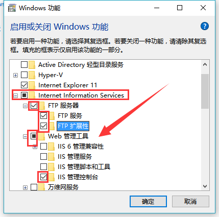 3.在“windows功能”中找到“Internet Information Services”,并选中“FTP服务”、“FTP扩展性”和“IIS管理控制台”前的复选框,点击“确定”,如下图所示: