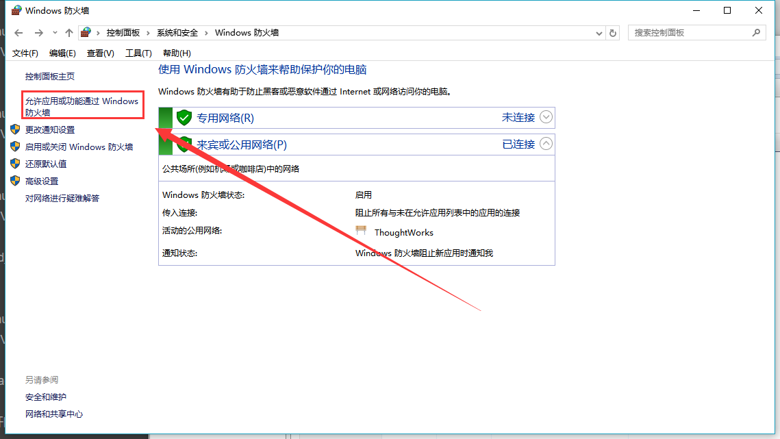 2.点击允许应用或功能通过Windows访问防火墙