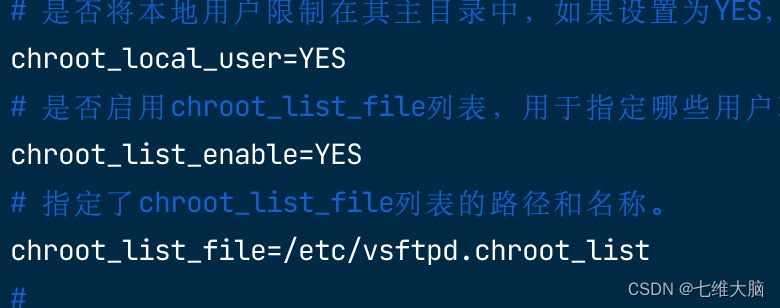 chroot_list_enable=YES,chroot_local_user=NO时,在/etc/vsftpd.chroot_list文件中列出的用户,不能切换到其他目录;未在文件中列出的用户,可以切换到其他目录。 - 当
