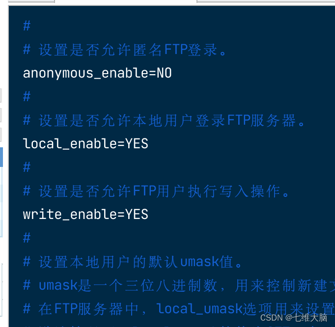 一般情况下这样设置一下就可以了,配置文件已经翻译好了,大家可以按需设置:(编辑配置文件命令:sudo vim /etc/vsftpd.conf)