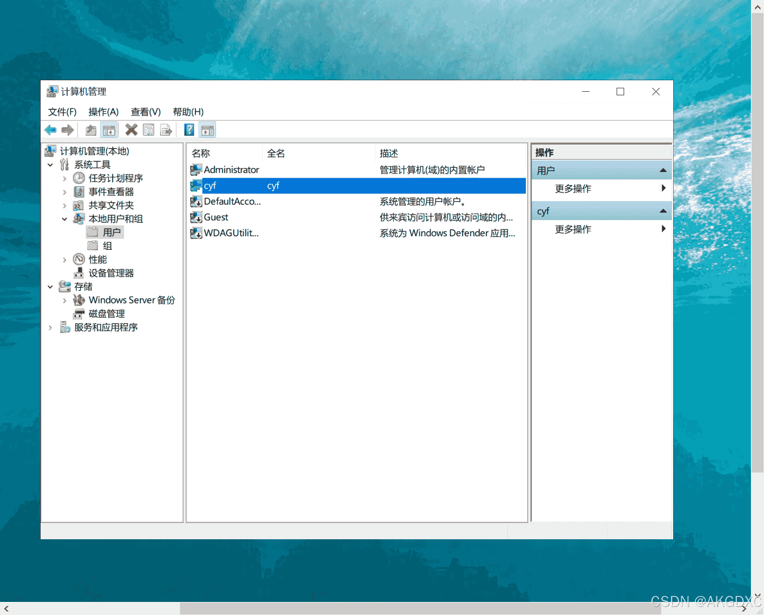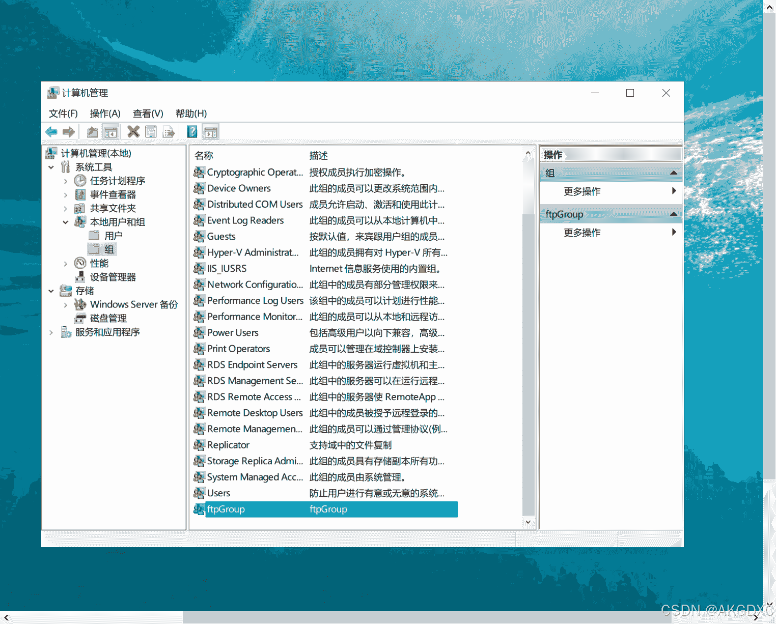 1.打开计算机管理–>创建组–>创建用户–>将创建的新用户设置为隶属你新建的组