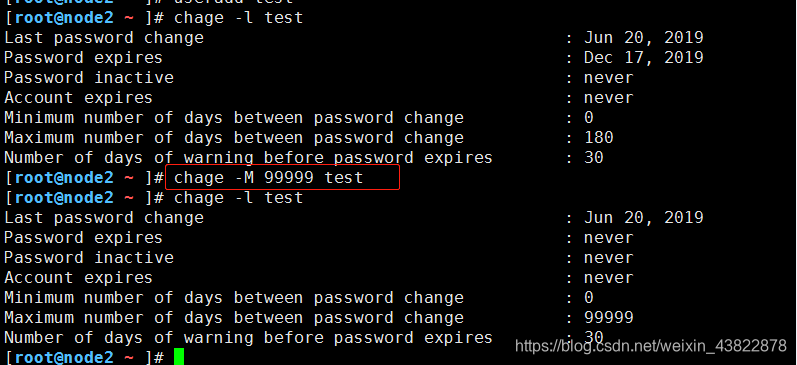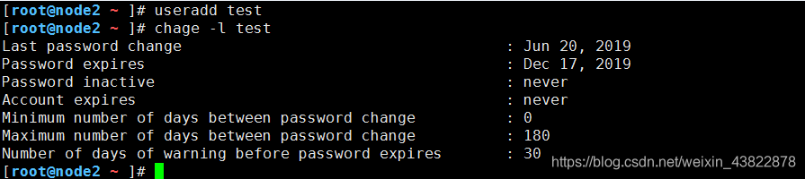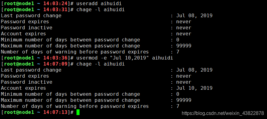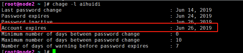 [root@node1 ~ 14:07:09]# chage -l aihuidi Last password change : Jul 08, 2019 Password expires : never Password inactive : never Account expires : Jul 10, 2019 Minimum number of days between password change : 0 Maximum number of days between password change : 99999 Number of days of warning before password expires : 7 [root@node1 ~ 14:07:13]#