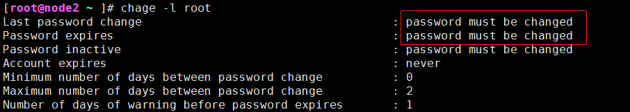[root@node2 ~ ]# passwd Changing password for user root. New password: Retype new password: passwd: all authentication tokens updated successfully. [root@node2 ~ ]# [root@node2 ~ ]# [root@node2 ~ ]# chage -l root Last password change : Jun 24, 2019 Password expires : Jun 26, 2019 Password inactive : never Account expires : never Minimum number of days between password change : 0 Maximum number of days between password change : 2 Number of days of warning before password expires : 1 [root@node2 ~ ]#