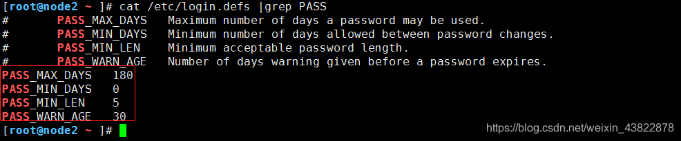 [root@node2 ~ ]# chage -d 0 -m 0 -M 180 -W 15 root 设置密码最低有效期0-180天,提前15天发警报提醒 [root@node2 ~ ]# chage -l root Last password change : Jun 20, 2019 最近一次密码更改:2019年6月20日 Password expires : Dec 17, 2019 密码过期:2019年12月17日 Password inactive : never 密码无效:从未 Account expires : never 帐户过期:从未 Minimum number of days between password change : 0 密码更改之间的最短天数:0 Maximum number of days between password change : 180 密码更改之间的最大天数:180天 Number of days of warning before password expires : 15 密码过期前的警告天数:15天 [root@node2 ~ ]#