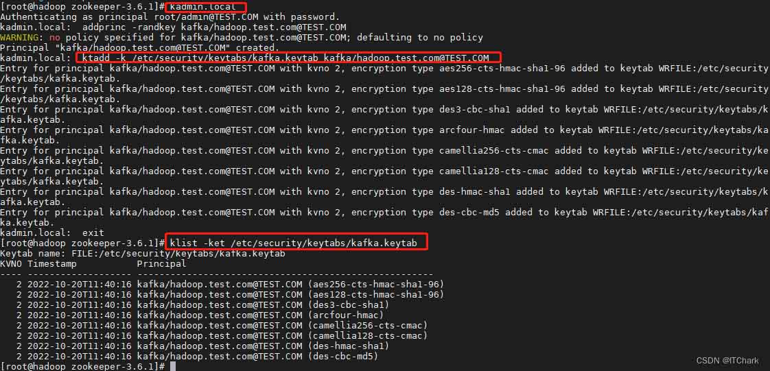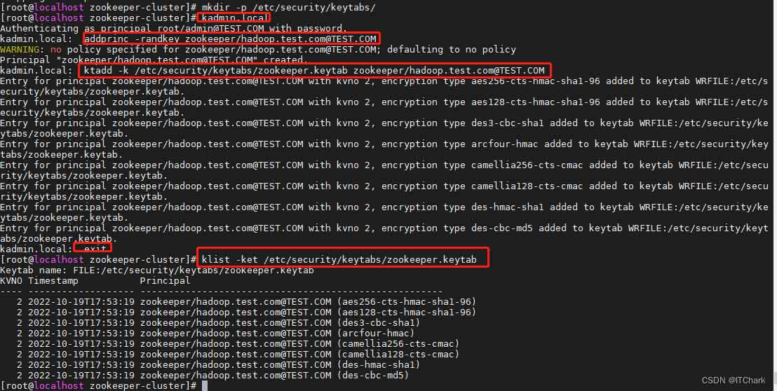 #登录kerberos的命令行界面 kadmin.local #生成随机密码 addprinc -randkey zookeeper/hadoop.test.com@TEST.COM #生成keytab文件 ktadd -k /etc/security/keytabs/zookeeper.keytab zookeeper/hadoop.test.com@TEST.COM #退出命令行 exit #查看生成的keytab文件的用户 klist -ket /etc/security/keytabs/zookeeper.keytab