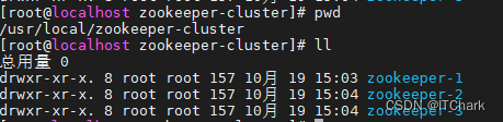 #创建集群目录 mkdir zookeeper-cluster #将解压好的zookeeper目录复制到集群目录中 cp -r zookeeper-3.6.1 zookeeper-cluster/ #进入集群目录中 cd zookeeper-cluster/ #重命名复制过来的目录为节点1目录,同理复制出节点2和节点3的目录 mv zookeeper-3.6.1 zookeeper-1 cp -r zookeeper-1 ./zookeeper-2 cp -r zookeeper-1 ./zookeeper-3