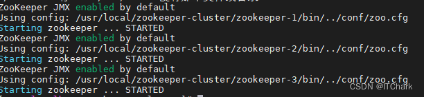 /usr/local/zookeeper-cluster/zookeeper-1/bin/zkServer.sh start /usr/local/zookeeper-cluster/zookeeper-2/bin/zkServer.sh start /usr/local/zookeeper-cluster/zookeeper-3/bin/zkServer.sh start