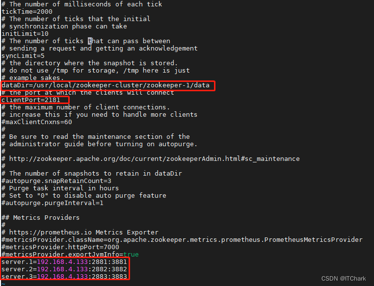 修改每个节点中的dataDir,clientPort的值,并增加节点之间的关联属性,以下是节点1的示例,其他节点以此类推: