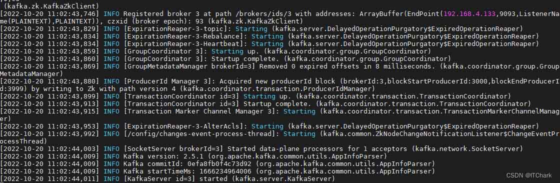 #启动节点1 /usr/local/kafka_2.12-2.5.1/bin/kafka-server-start.sh -daemon /usr/local/kafka_2.12-2.5.1/config/server-1.properties #启动节点2 /usr/local/kafka_2.12-2.5.1/bin/kafka-server-start.sh -daemon /usr/local/kafka_2.12-2.5.1/config/server-2.properties #启动节点3 /usr/local/kafka_2.12-2.5.1/bin/kafka-server-start.sh -daemon /usr/local/kafka_2.12-2.5.1/config/server-3.properties #查看服务日志 tail -f /usr/local/kafka_2.12-2.5.1/logs/server.log