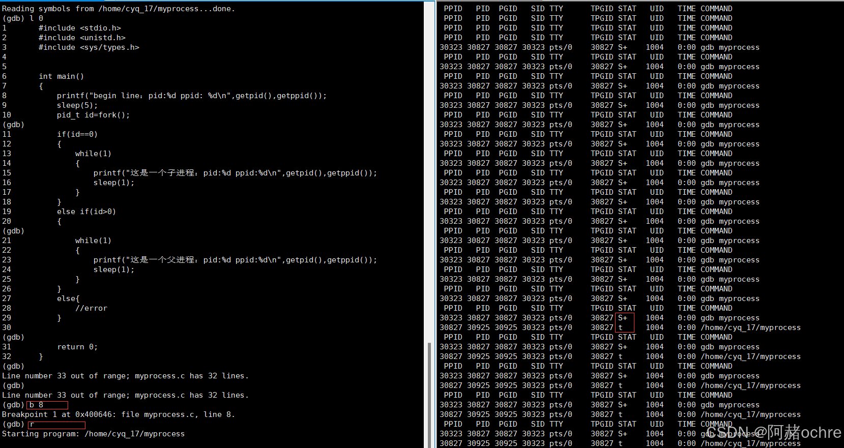 • T停止状态:可以通过发送SIGSTOP来停止进程,可以发送SIGCONT来让进程继续运行,当一个进程想要获取某种资源或者被其他进程控制(如gdb),就可能会出现T状态