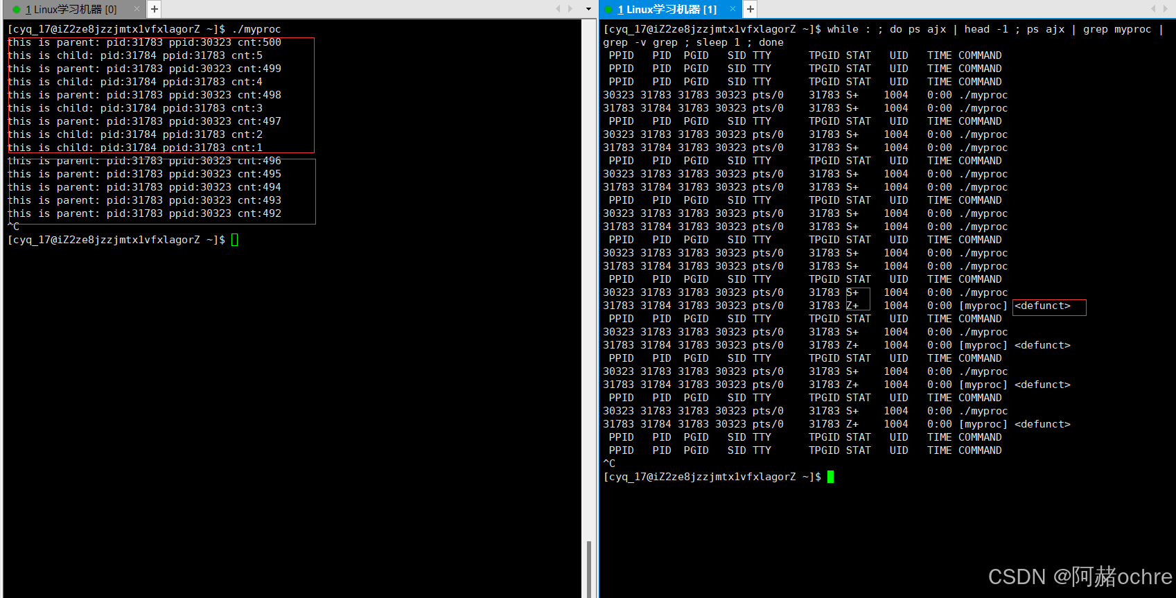 • 为了让子进程在退出的时候可以被回收退出信息。此时退出进程不能再用Ctrl C 而应该使用kill -9 杀掉进程