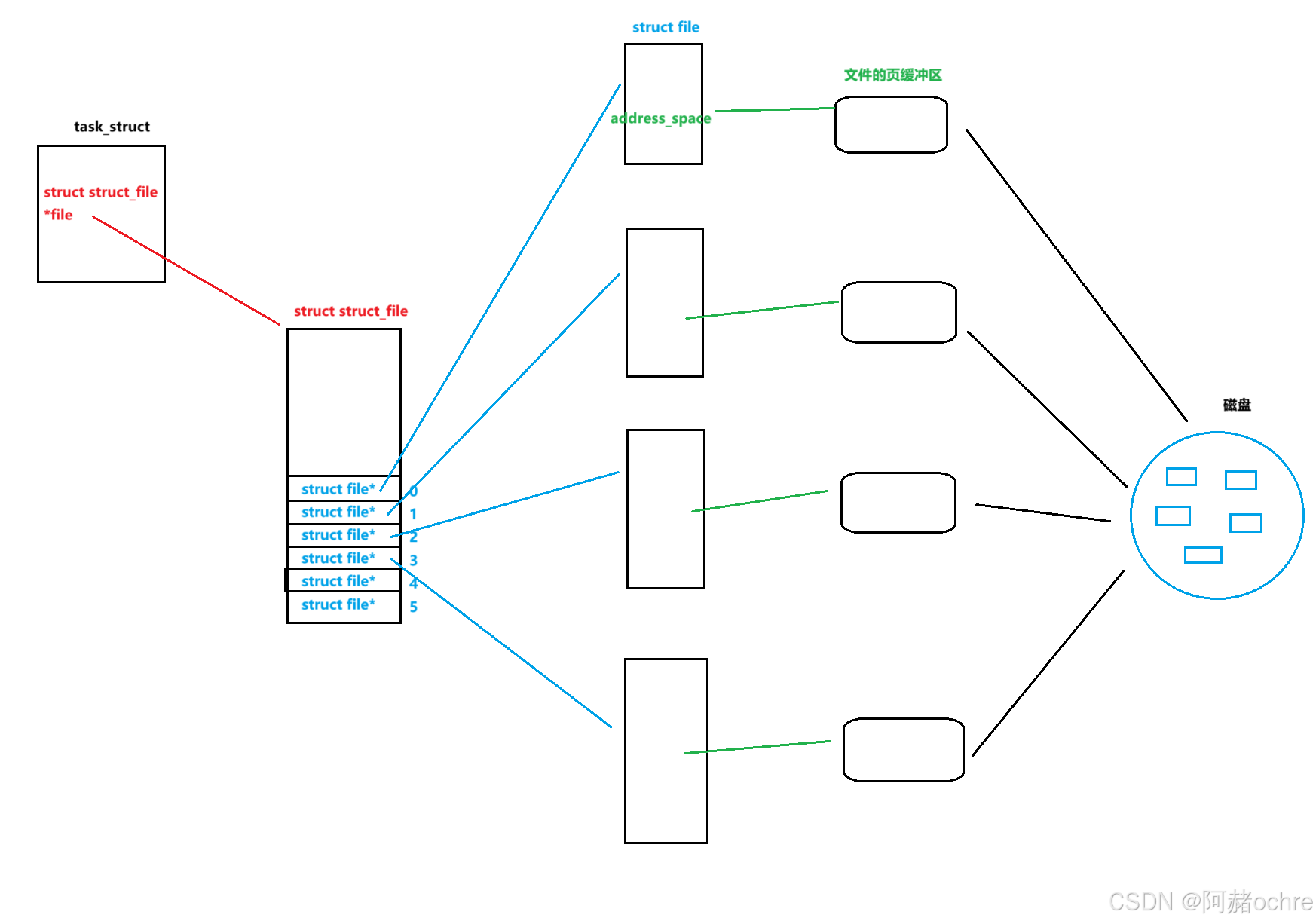 - 当一个进程open()一个文件时,操作系统会在struct_file的指针数组中从下标为0的地方在开始寻找一个没有被使用过的数组位置,填入要打开文件的struct file*,再将数组下标返回给open( )调用,作为该文件的文件描述符fd