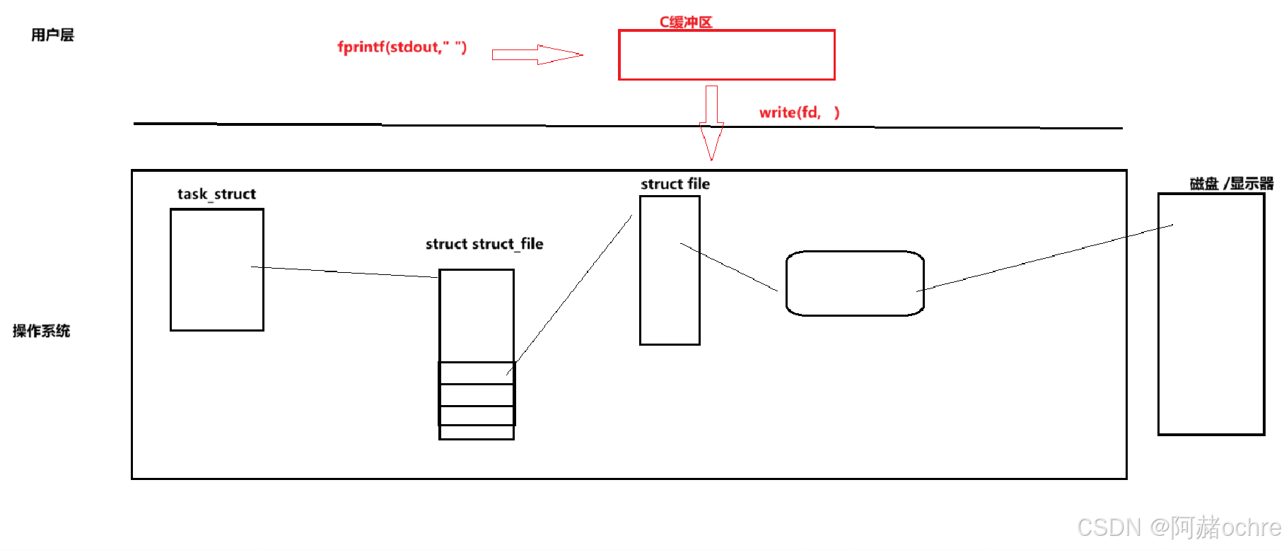 那这个用户级缓冲区谁提供呢? printf fwrite 是库函数, write 是系统调用,库函数在系统调用的“上层”, 是对系统 调用的“封装”,但是 write 没有缓冲区,而 printf fwrite 有,说明该缓冲区是二次加上的,由C标准库提供