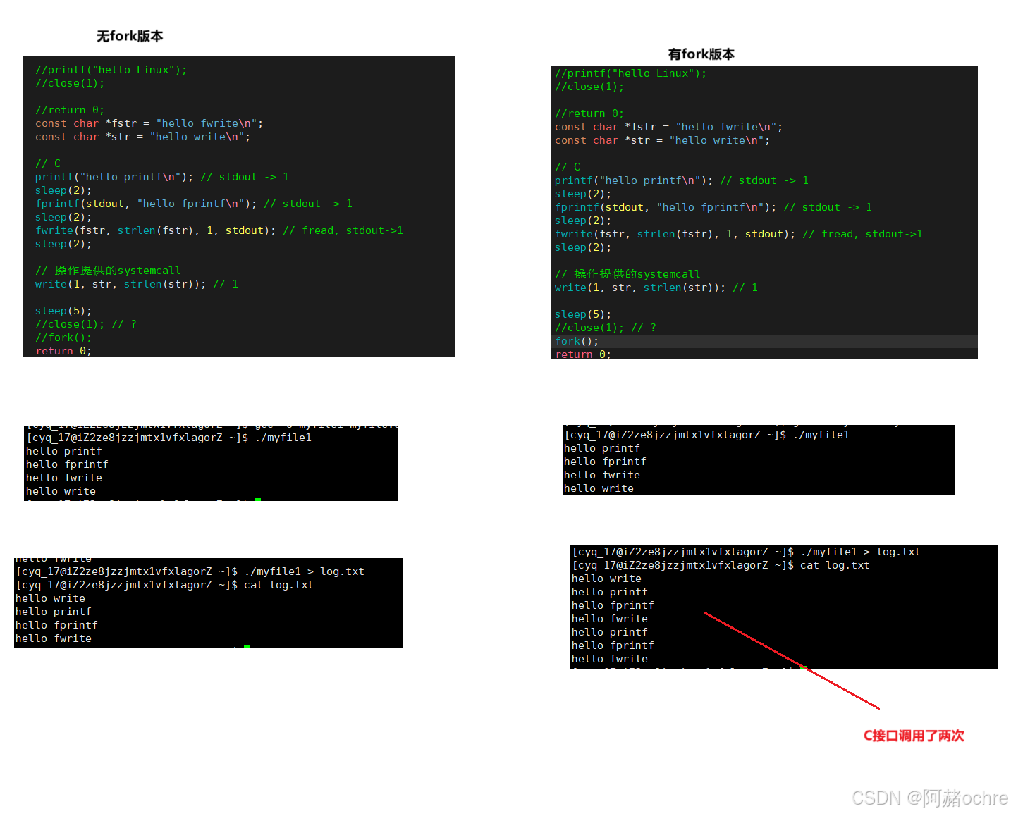 我们发现 printf 和 fwrite (库函数)都输出了 2 次,而 write 只输出了一次(系统调用),为什么呢?肯定和 fork有关!