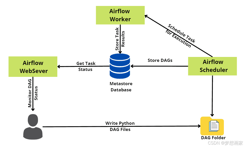- 排队任务:调度程序通过将任务放在任务队列中来排队执行任务,该任务队列由气流工作器拾取。