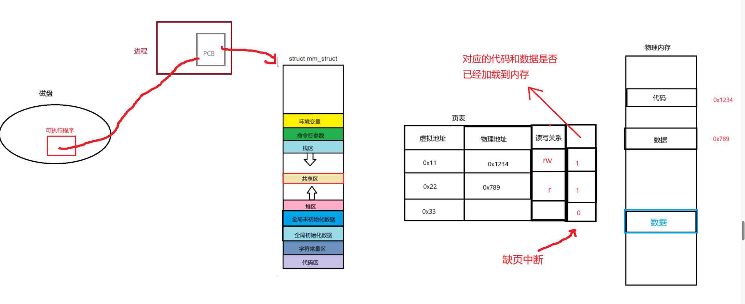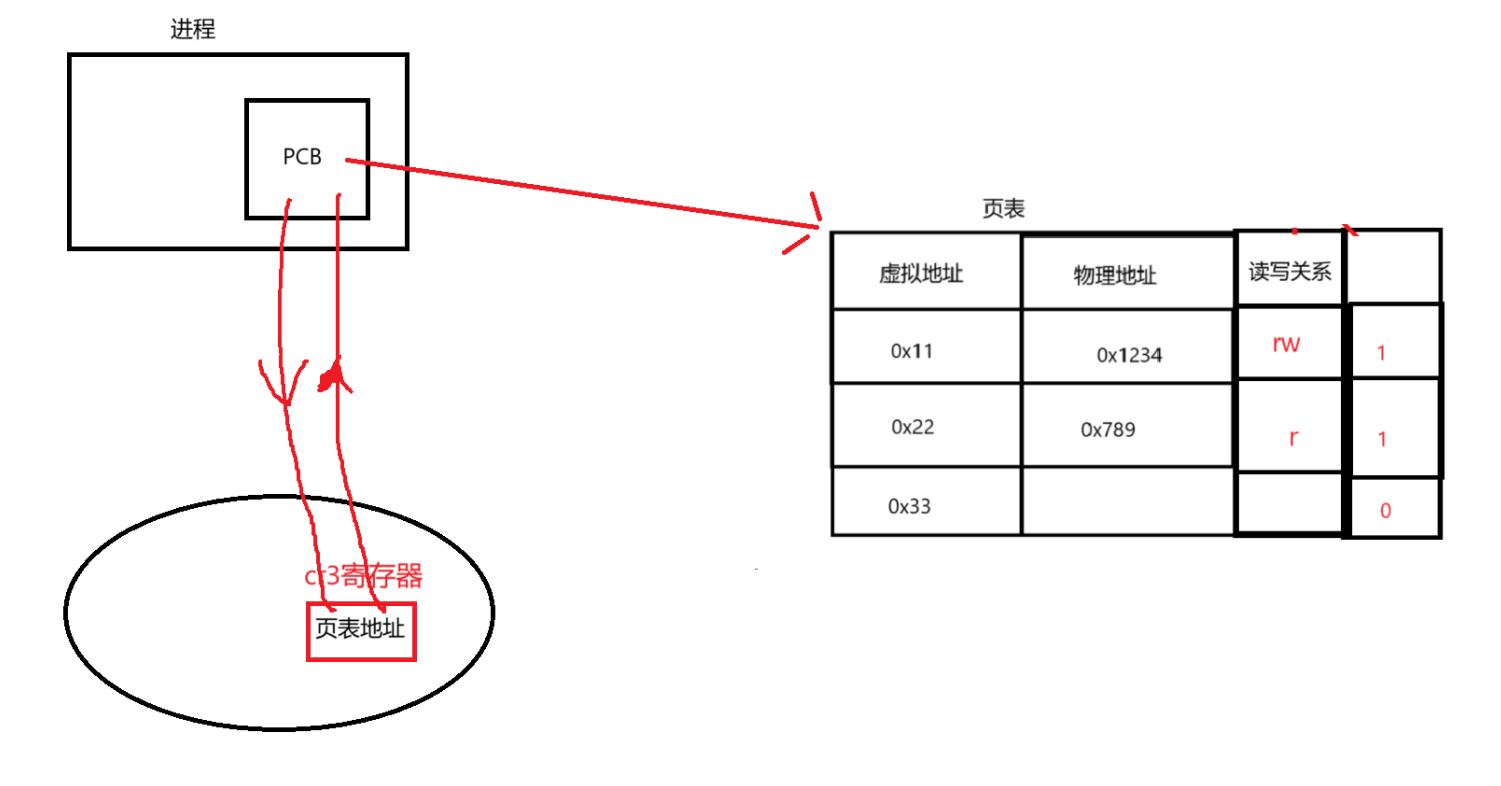 页表中还有一个管理权限判断判断进程的代码和数据是否已经加载到了内存,0为没有加载到内存,而1则相反,这只是一个简化理解
