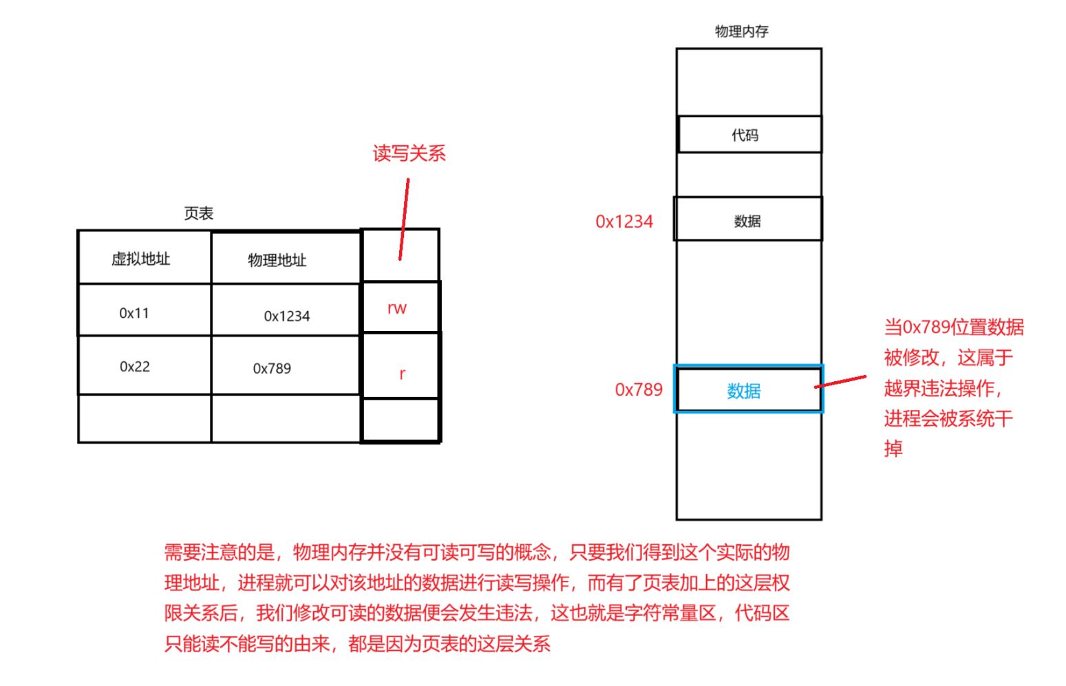 其实页表也有一种权限管理判断是否可以读写,当你对数据区进行映射时,数据区是可以读写的,相应的在页表中的映射关系中的权限就是可读可写,但是当你对代码区和字符常量区进行映射时,因为这两个区域是只读的,相应的在页表中的映射关系中的权限就是只读,如果你对这段区域进行了写,通过页表当中的权限管理,操作系统就直接就将这个进程干掉。