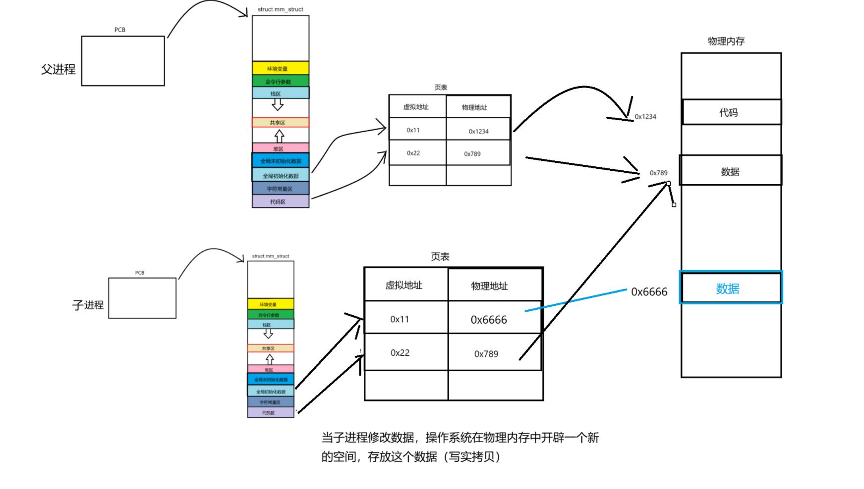 但是当子进程对数据修改时,操作系统会在物理内存中进行写实拷贝,开辟出一个新的物理地址,里面存放子进程修改后的数据,并且此时页表会更新映射的物理地址。(这就回答了上面父子进程中为什么g_val的值不同,而进程地址相同的原因)