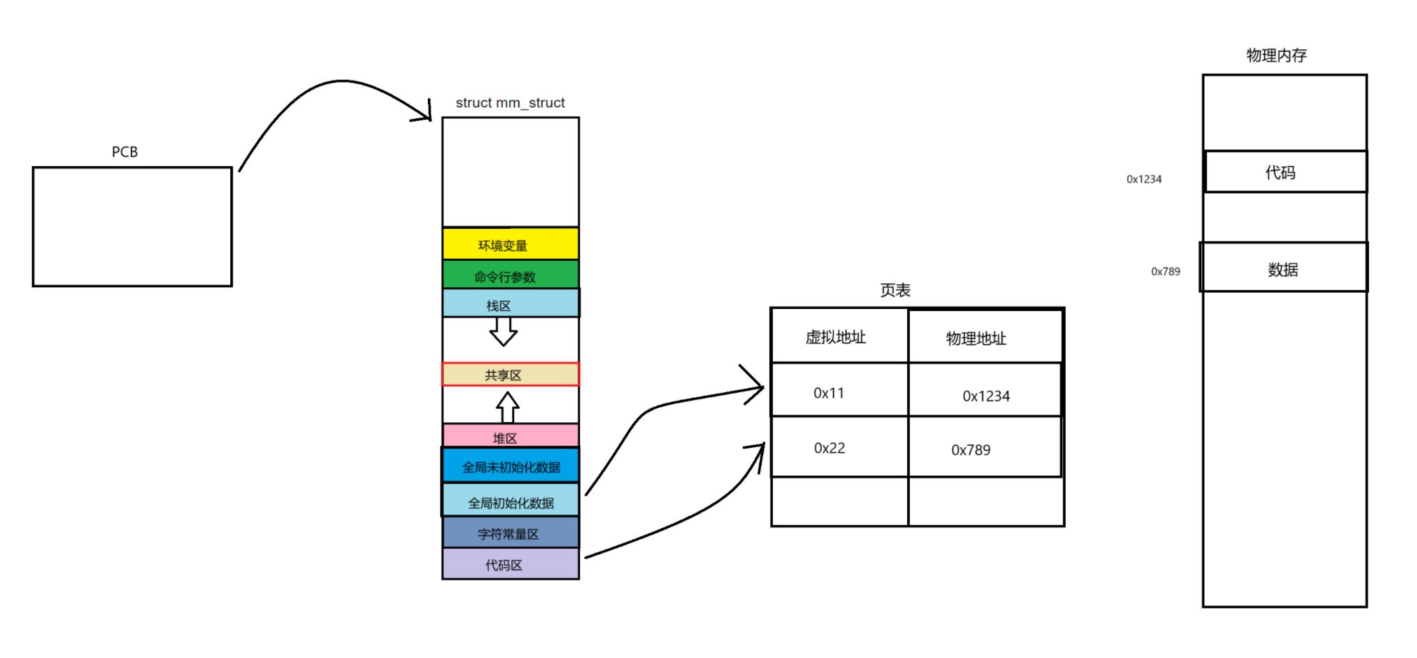 每一个进程都会有一个PCB(task_struct结构体),而PCB中有一个指针指向各自进程的地址空间,进程将自己的代码和数据首先放在虚拟地址空间的对应的区域,在这其中会有一种表结构,叫做页表,页表的核心工作就是完成虚拟地址到物理地址之间的映射。之后,我们的代码和数据通过页表的映射加载到实际的物理内存中。