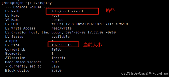 如图,/dev/centos/root 是当前逻辑卷LV的挂载路径。