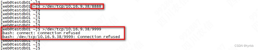 用法:>/dev/tcp/${ip}/${port},如下表示成功和失败