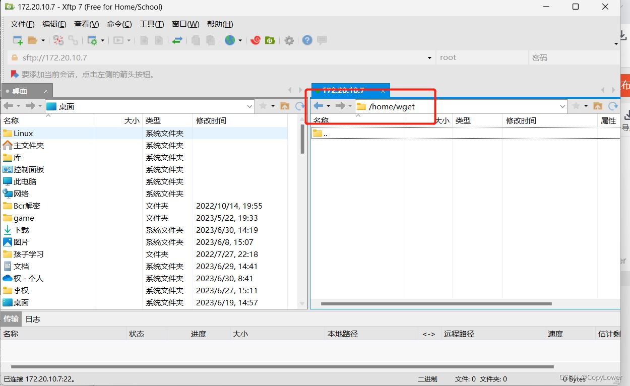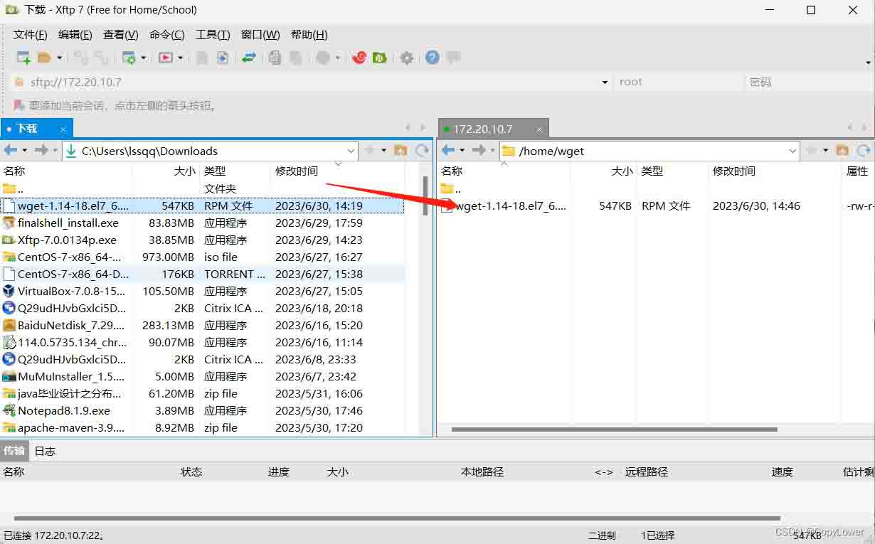 将下载好的wget-1.14-18.el7_6.1.x86_64.rpm安装包通过xftp上传到虚拟机服务器上的目录中,如在虚拟机的/home目录下创建一个wget文件目录,将刚下载的rpm安装包上传到wget目录下。