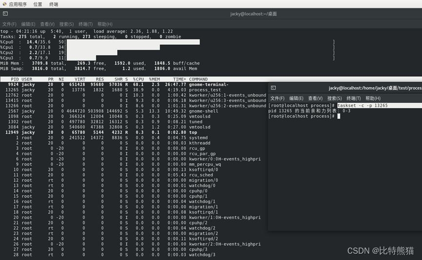 可以从输出的信息看出,pid 为13265的进程(即当前的测试进程)的亲和力CPU为0-3,即它同时运行在了0,1,2,3这四个CPU上面。