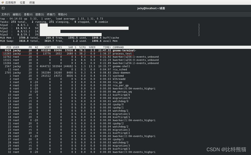 通过系统调用sched_setaffinity进行绑定,通过sched_getaffinity获取绑定关系。注意这对方法是进程级别的绑定。代码中指定cpu0和cpu3,我们可以通过top查看,两个CPU使用达到了100%,其他的CPU均不会(正常场景)。