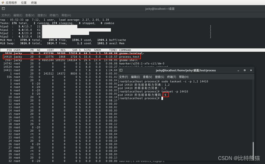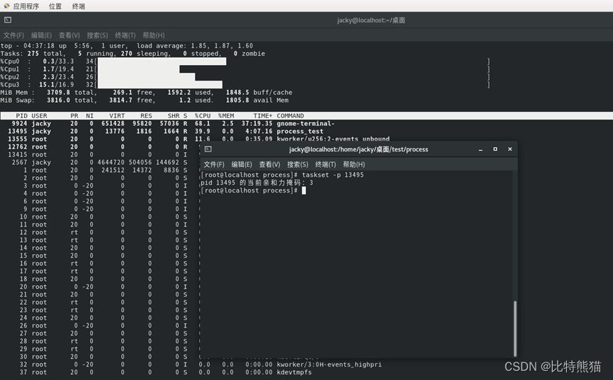 由当前亲和力掩码可以看到,为6,说明此时运行在CPU1和CPU2上。(2^1 + 2^2 = 6)