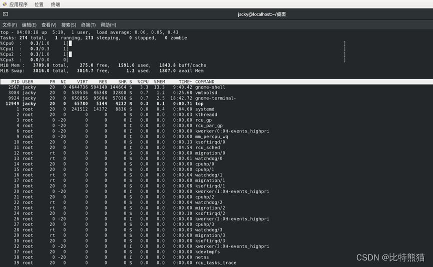 以本机中虚拟机为例,有4个CPU(分别为:CPU0, CPU1, CPU2, CPU3),每个CPU有1个核。