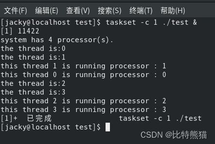 // 此代码不完整,只是帮助理解绑定过程 // 在创建线程时添加以下代码,可以将该线程绑定到1核 cpu_set_t mask; // 将掩码清零 CPU_ZERO(&mask); // 将1添加到掩码中 CPU_SET(1, &mask); // #将本线程绑定到1核 sched_setaffinity(0, sizeof(cpu_set_t), &mask);