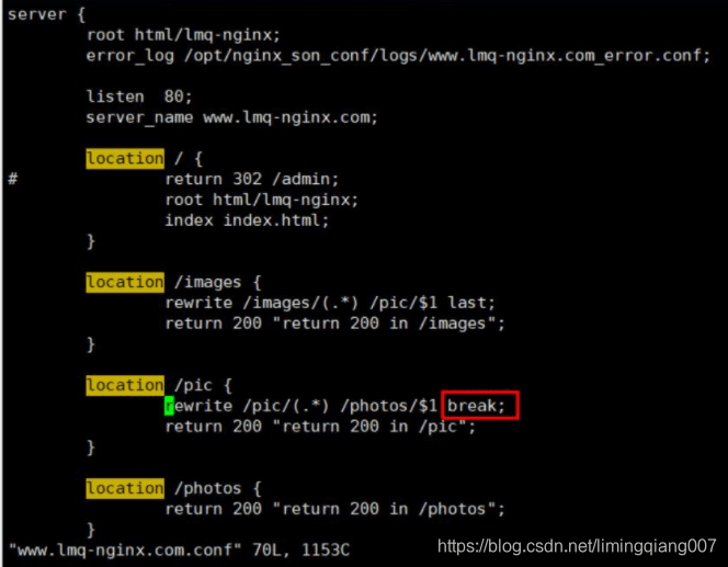 • 遇到last值,会重新触发请求。在server段/pic的location段。