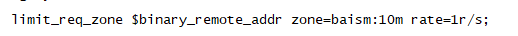 limit_req_zone $binary_remote_addr zone=baism:10m rate=1r/s;