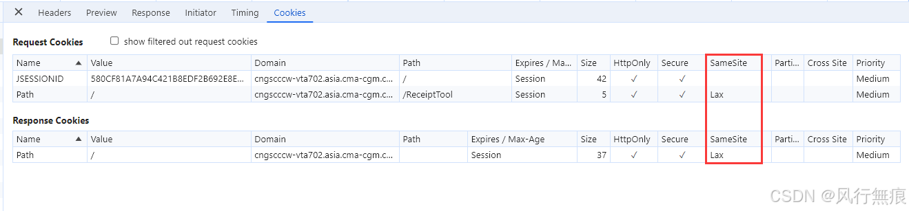 浏览器F12 在网络下查看当前状态,SameSite属性缺失,我们需要通过配置nginx将SameSite属性设置为Strict或者 Lax。