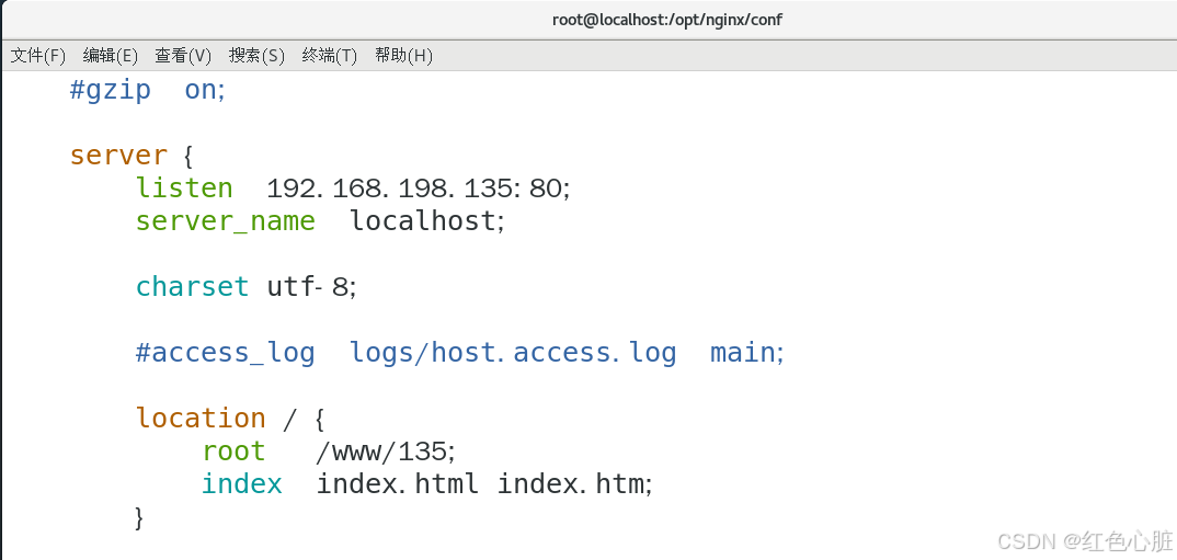 释:修改本机地址135的server配置参数,如上图所示当192.168.198.135的请求到来,让nginx去/www/135文件夹下寻找资料