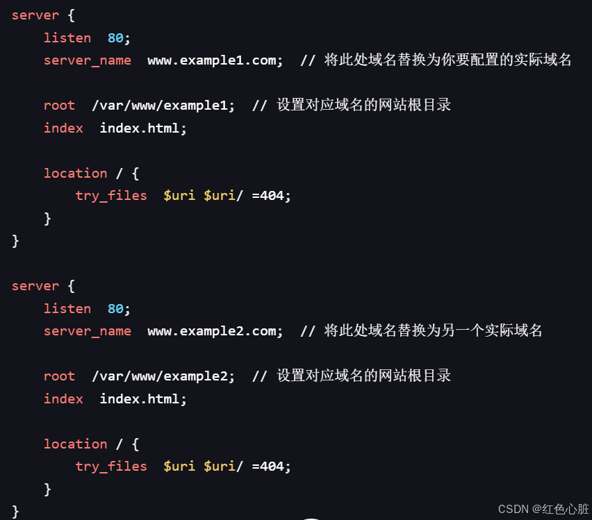 • server_name:指定虚拟主机对应的域名,如 www.example1.com 和 www.example2.com ,你需要将其修改为你实际拥有的域名。
