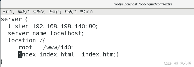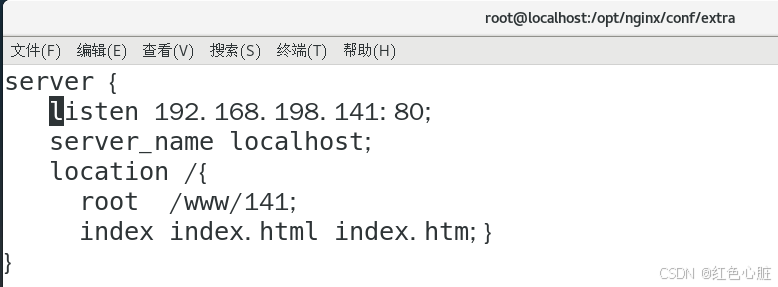 在141.conf下添加如上代码,当用户通过 192.168.198.141 访问该服务器的 80 端口时,Nginx 会从 /www/141 目录提供服务,并优先寻找 index.html 或 index.htm 作为默认页面