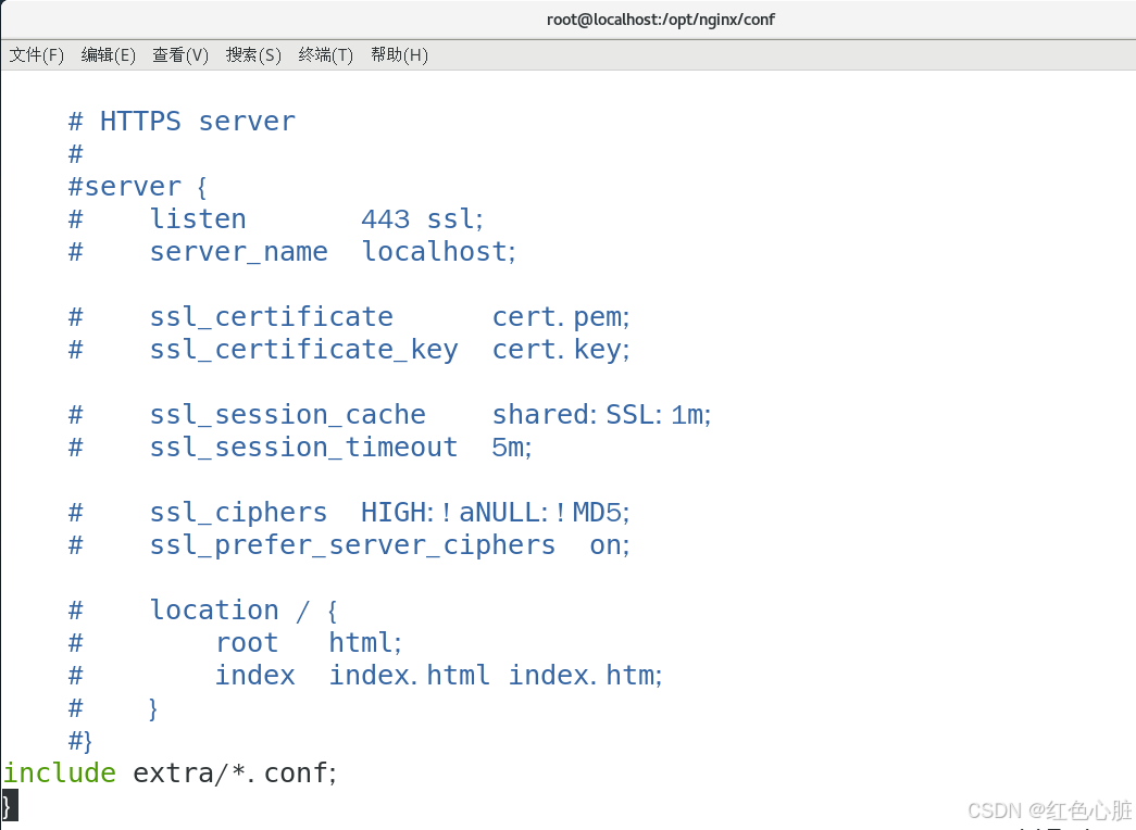 释:在http()标签中的最后一行,添加如下参数,让extra目录下的配置参数,导入到nginx.conf中,让nginx主配置文件,看起来简洁清晰 ,不写绝对路径是因为extra文件夹和nginx.conf文件夹为相对,都在同一文件夹下